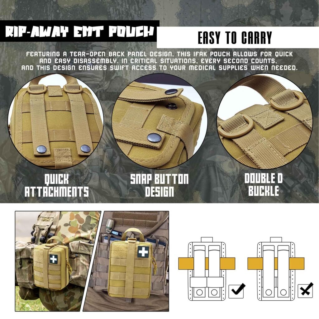 • EASY TO USE:The molle medical pouch rip away can be built for rapid removel. As a tactical med pouch, it is easy to tear and take out the required supplies in an emergency.And our ifak pouch has two-way zippers and silent cord pulls, fully opened for accessing the first aid supplies easily once emergencies happen. Durable metal zippers protect emergency supplies better.