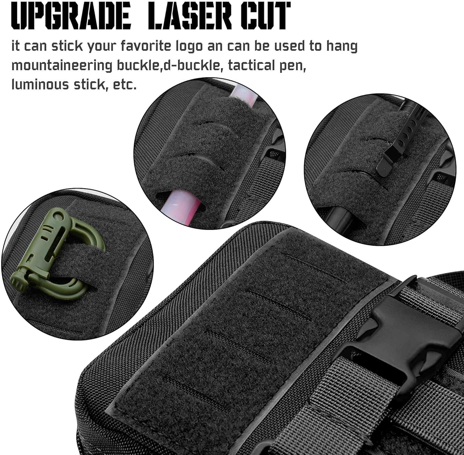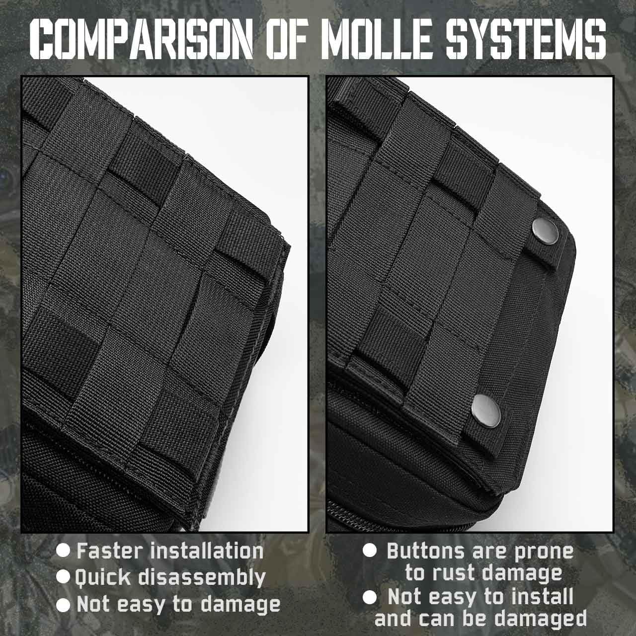 【MOLLE System Design】: Two secure back straps with snap buttons facilitate easy attachment to tactical backpacks, shoulder straps, duty belts and vest carriers.